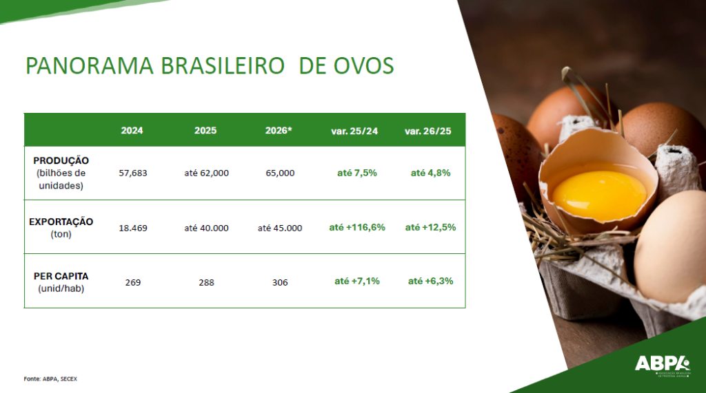 No setor de ovos, o cenário também é de forte expansão. A produção em 2025 deve chegar a 62 bilhões de unidades, 7,5% acima das 57,6 bilhões registradas no ano anterior. Para 2026, a projeção é de 65 bilhões de unidades. O consumo per capita, por sua vez, deverá saltar de 269 ovos por habitante em 2024 para 288 ovos em 2025 e 306 em 2026, consolidando o Brasil entre os maiores consumidores do mundo. Paralelamente, as exportações devem mais que dobrar em 2025, podendo alcançar 40 mil toneladas (alta de 116,6%), com expectativa de nova elevação em 2026, chegando a 45 mil toneladas.