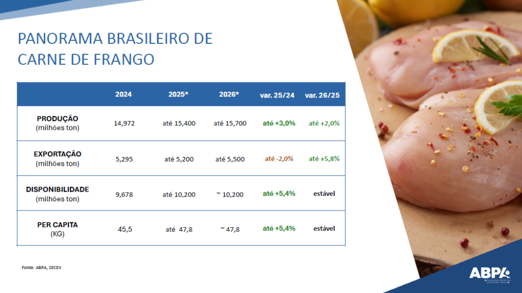 Mesmo com uma leve retração projetada nas exportações em 2025, que podem atingir 5,2 milhões de toneladas, a ABPA projeta retomada para o ano seguinte, com 5,5 milhões de toneladas exportadas, sinalizando um novo ciclo de crescimento nos embarques internacionais. Destinos como Emirados Árabes Unidos, Japão, México e África do Sul seguem entre os principais mercados da carne de frango brasileira.