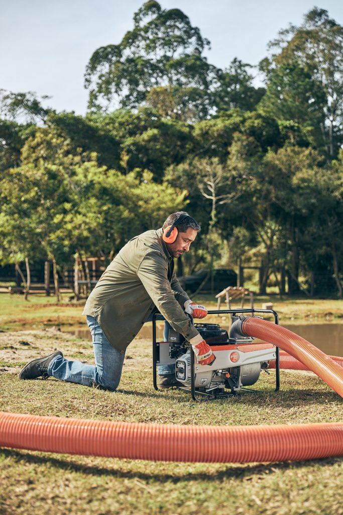 As motobombas são indispensáveis para o manejo da água e com o equipamento, o produtor pode irrigar plantações, drenar áreas alagadas ou transferir água de reservatórios para o gado, garantindo recurso hídrico em qualquer situação. A solução acaba sendo importante em momentos críticos com a estiagem, que nos últimos anos impactou muito o Rio Grande do Sul. A motobomba STIHL WP 300, que possui entrada e saída de 2 polegadas, e a WP 600, que possui entrada e saída de 3 polegadas, são destinadas para médio e alto volumes de bombeamentos. Ambas possuem potência máxima de 4,4 kW e 212 cilindradas. O modelo de entrada possui uma vazão máxima de água de 37 m³/h, vazão máxima de saída de água de 616 l/min, enquanto o intermediário apresenta 63 m³/h e 1.050 l/min, respectivamente. Já a WP 900 é a de maior potência e oferece 5,2 kW e uma entrada e saída de 4 polegadas. Desta forma, é possível alcançar a vazão máxima de 94 m³/h e a vazão máxima de saída de água de 1.567 l/min. As alturas máximas de sucção são entre 6,5 e 7 metros, podendo bombear água a alturas que variam entre 31 e 34 metros dependendo do modelo. Os motores dos três lançamentos são de 4 tempos a gasolina.