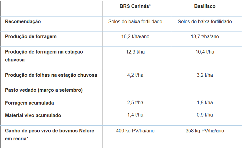 Em comparação com o Basilisk, a BRS Carinás produz 18% a mais de forragem na estação chuvosa, com destaque para maior produção de lâminas foliares, componente de maior valor nutritivo da planta. “Quando vedada para uso no período seco, a BRS Carinás oferece 40% a mais de massa de forragem em relação à cultivar Basilisk, da qual a maior parte [53%] é material vivo [folhas e pressas]”, detalha o pesquisador da Embrapa Cerrados (DF) Allan Kardec Ramos .