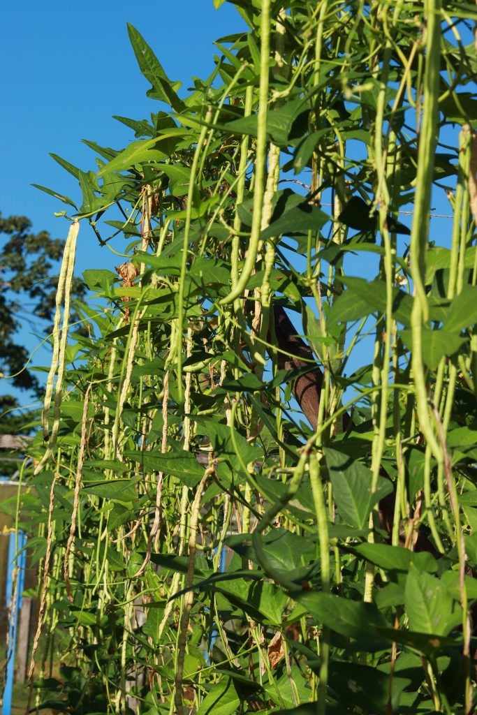 O espaldeiramento (amarração para dar sustentação aos ramos da planta) em formato de V é uma inovação recomendada para o cultivo do feijão-de-metro. O cultivo em espaldeira é uma prática agrícola antiga que evita que a planta entre em contato com o solo. “Tradicionalmente, no Pará a amarração nessa estrutura é feita de forma vertical ou como um V invertido. Com o novo formato observamos mudanças muito positivas na produtividade, sanidade, facilidade de colheita e qualidade da produção”, relata Gomes.