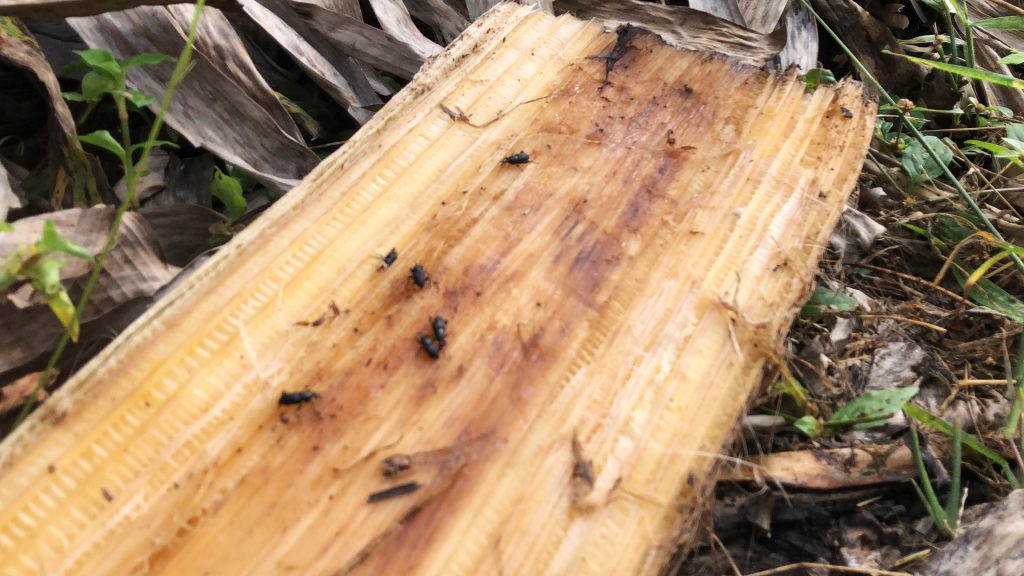 Já a armadilha sanduíche é produzida colocando as duas partes obtidas pelo corte do pseudocaule uma em cima da outra na posição horizontal na base da touceira da banana. “Fica, então, uma telha embaixo e outra em cima. Os insetos atraídos vão ficar entre uma fatia e outra”, conta Marilene.