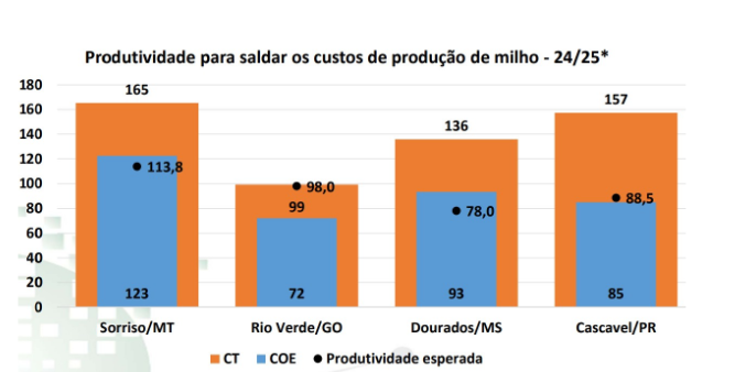 Rosa explica que, dados do Cepea/USP indicam as dificuldades para a próxima safra devido ao aumento nos custos de produção, somados à queda no preço pago ao produtor pela saca de milho. “No caso de Sorriso/MT o custo total da lavoura de milho por hectare está estimado em 165 sacas de milho, enquanto a produtividade média do Estado está em 113,8 sacas por hectare. Em Rio Verde/GO, o custo total do hectare está em 99 sacas e a produtividade média do Estado é de 98 sacas. Logo, os produtores terão que superar a produtividade média do Estado para apenas cobrir os custos com a lavoura”. Já em Sorriso, o produtor terá que aumentar a produtividade de 113 para 165 sacas de grãos de milho por hectare somente para cobrir os custos de produção, conforme mostra o gráfico abaixo: