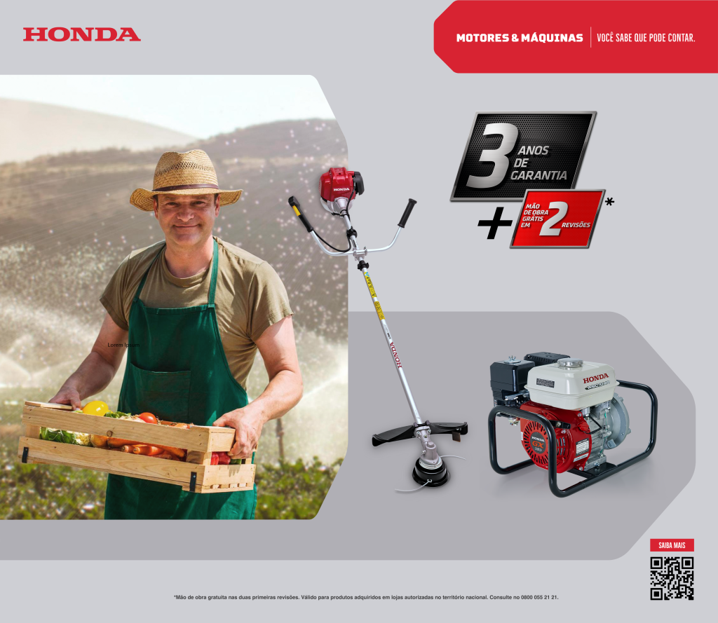 E não para por aí: a mesma Honda ainda produz motores que podem ser utilizados em pulverizadores para pequenas plantações, como o GX160, e até mesmo para transporte fluvial, como o GX390 Mega, um motor potente para rabetas, econômico e confiável. Vale lembrar que todos os produtos da marca contam com uma ampla rede credenciada que oferece 3 anos de garantia e mão de obra grátis nas duas primeiras revisões.