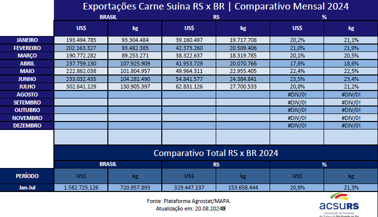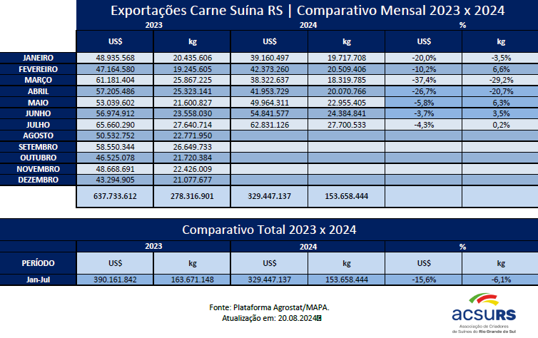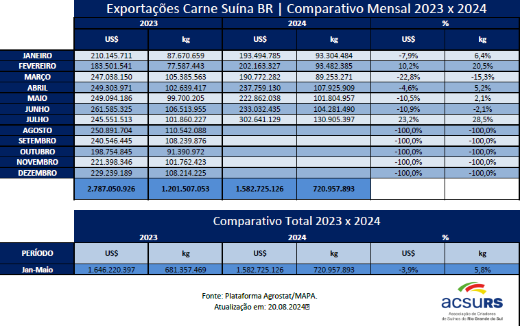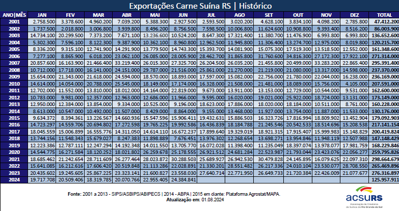 Dados do IBGE referentes ao primeiro semestre de 2024 apontam que o mês de julho fechou com o maior volume exportado de carne suína brasileira da história para um só mês, com 119,3 mil toneladas de carne in natura, 27% a mais que julho de 2023 e 27,14% superior que junho/24. A última vez que os volumes de carne suína in natura embarcada ultrapassaram 100 mil toneladas foi em agosto de 2022.