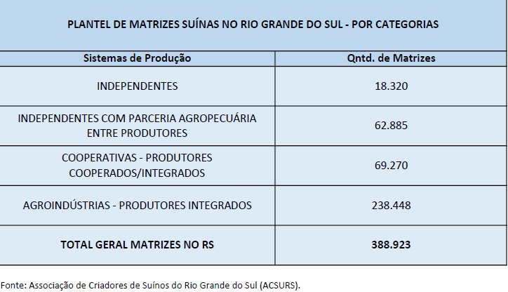 No Rio Grande do Sul, em torno de 23% da suinocultura é feita por produtores independentes, e o restante dentro do sistema das cooperativas e das agroindústrias.